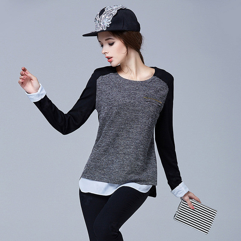 Chiffon Blouse: Chiffon Knitted Patchwork Long Sleeve Thick Shirt